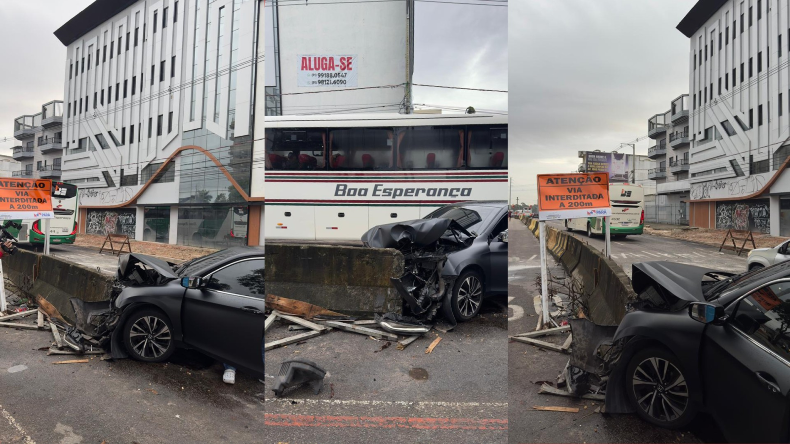 Um carro se chocou contra uma mureta que sinaliza uma área de interdição na avenida João Paulo II, em Belém, nesta terça-feira (17).