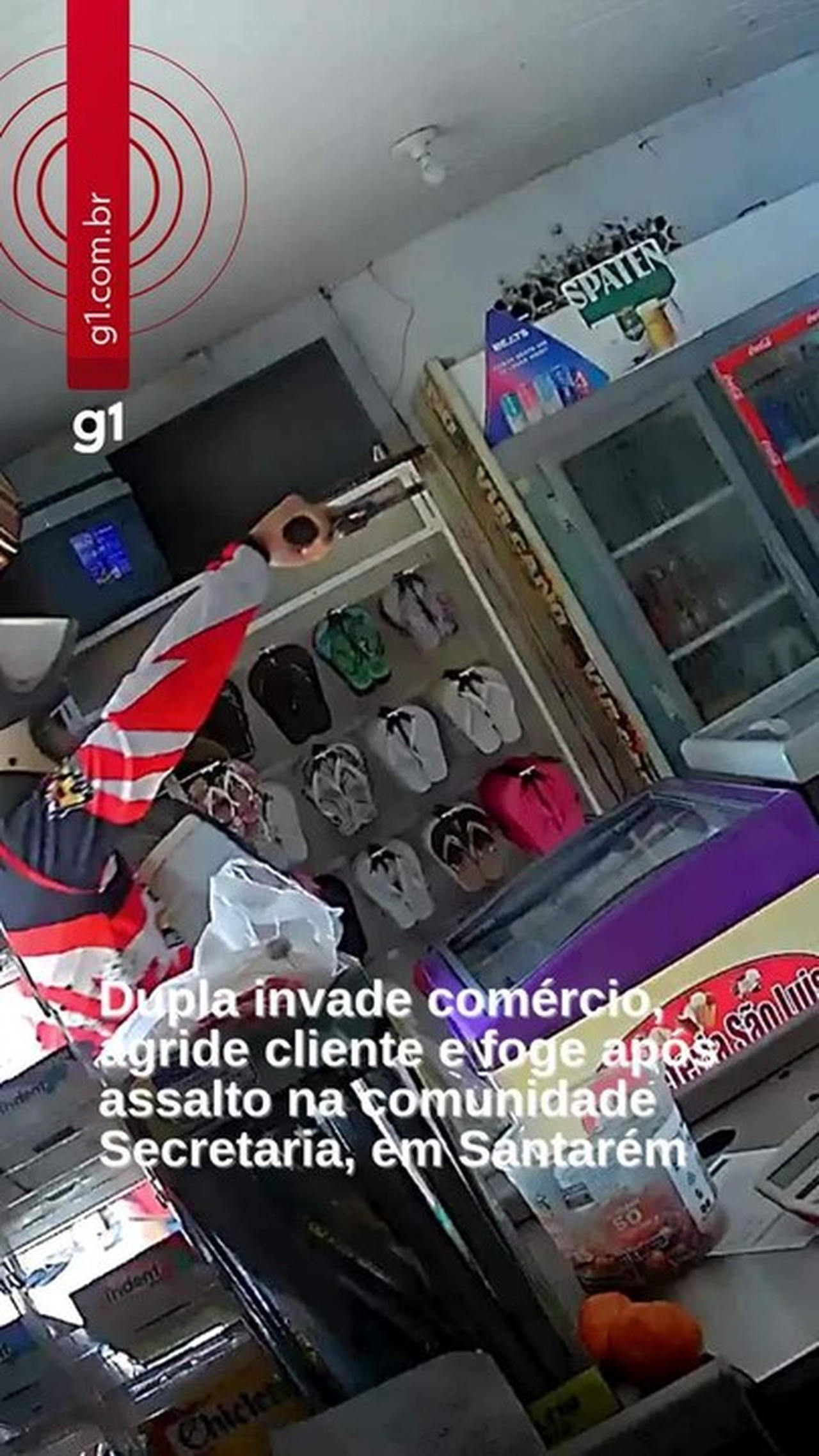 Um assalto registrado por câmeras de segurança na sexta-feira (20) assustou moradores da comunidade Secretaria, às margens da rodovia PA-370, em Santarém, no oeste do Pará. Dois criminosos armados invadiram um estabelecimento comercial, renderam o funcionário e ainda agrediram um cliente durante a ação.