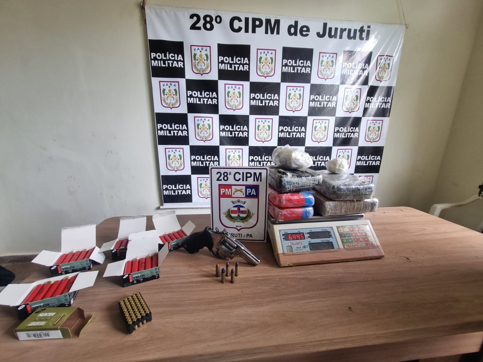 Na continuidade das buscas, outra caixa foi encontrada contendo um revólver calibre .38 da marca Taurus, com numeração suprimida, acompanhado de cinco munições do mesmo calibre. Além disso, foram identificados cinco tabletes de substâncias entorpecentes, sendo três de skunk (pesando 3,66 kg) e dois de oxi (2,128 kg).
