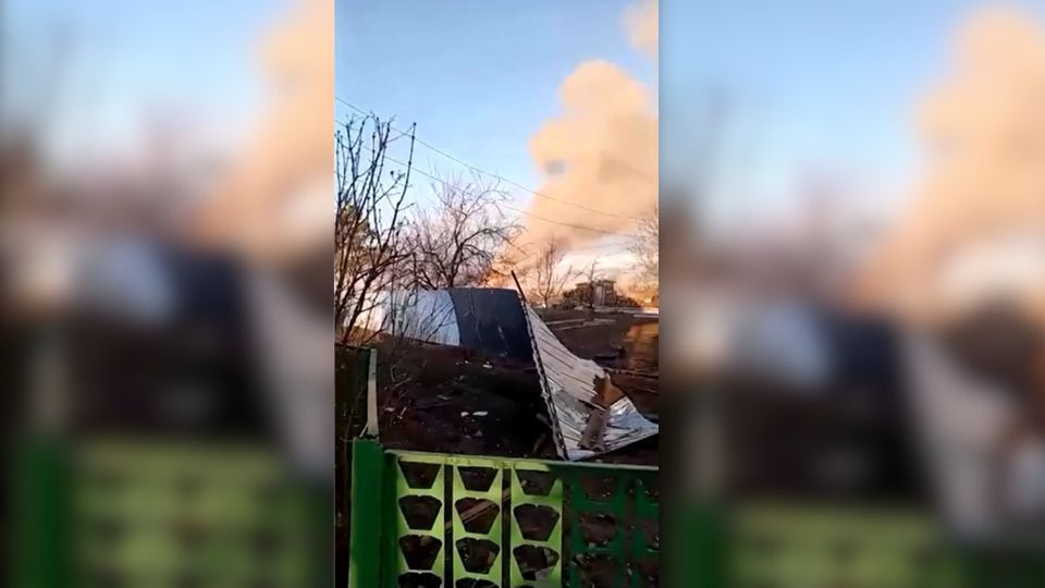 O vídeo verificado pela Reuters com base na posição e no formato dos edifícios mostrou uma coluna de fumaça subindo acima dos chalés danificados.