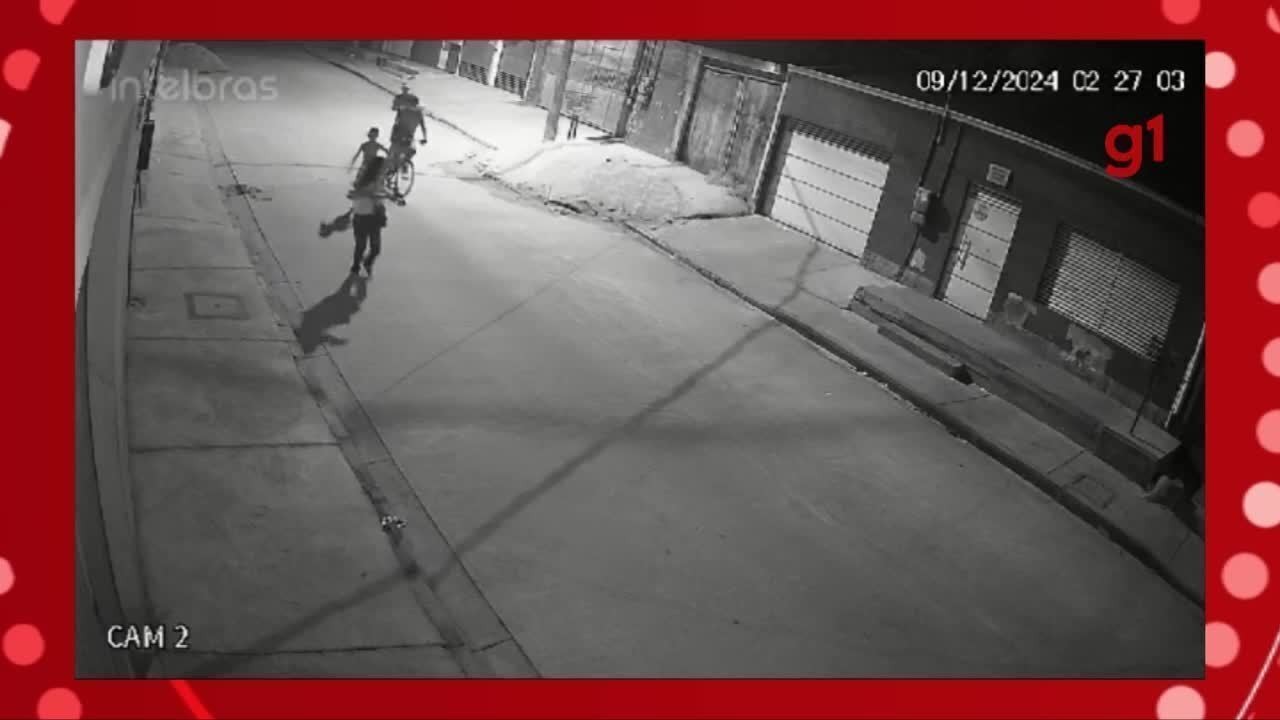 A criança, um menino de porte magro, aparece se aproximando da vítima no guidão de uma bicicleta onde há dois criminosos, um conduzindo o meio de transporte e outro na garupa, em pé.