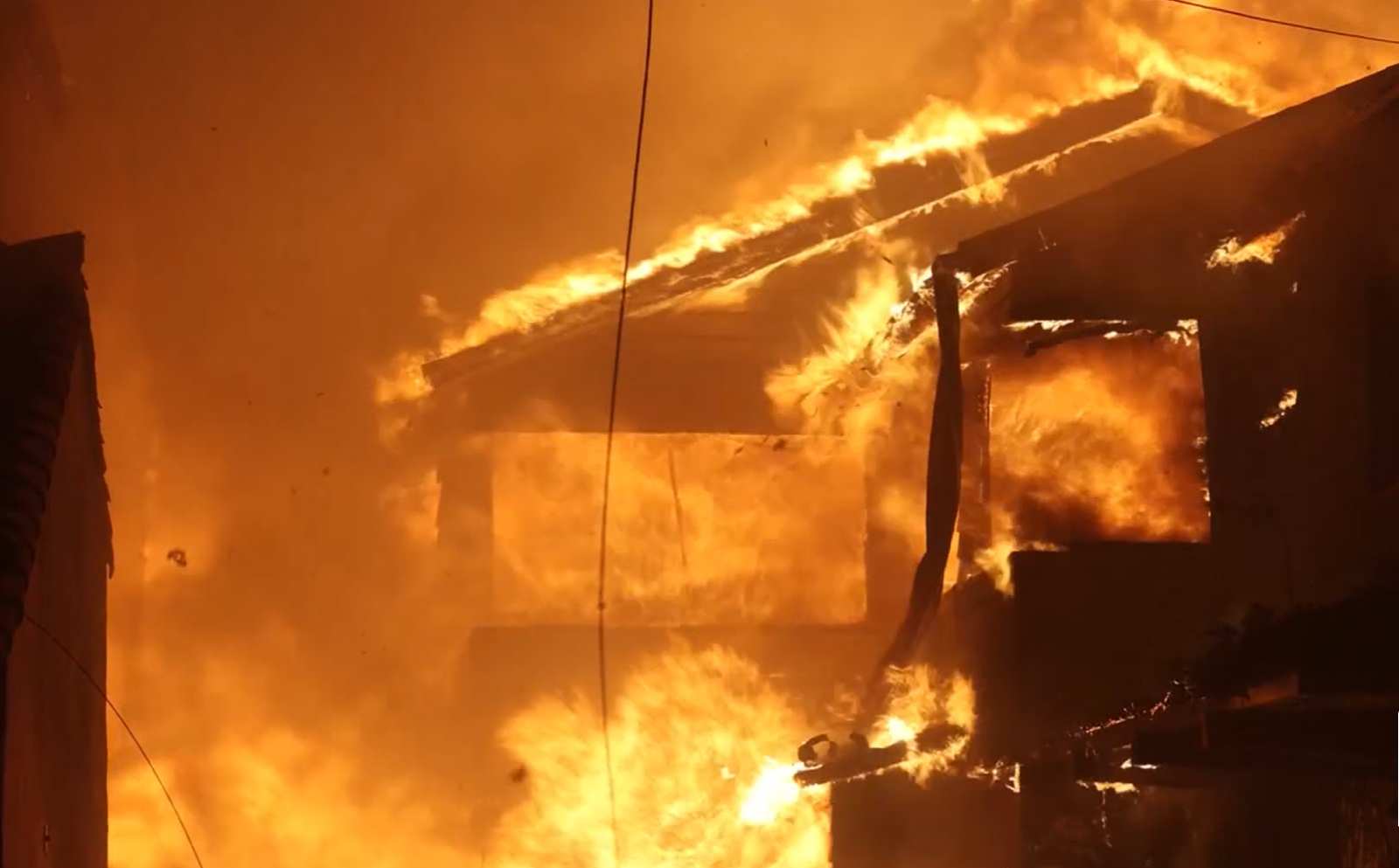 As imagens mostram as chamas engolindo uma casa e linhas de energia caídas balançando em meio a fortes ventos.